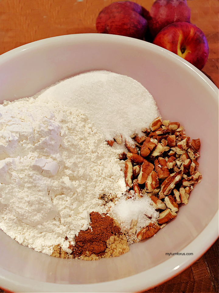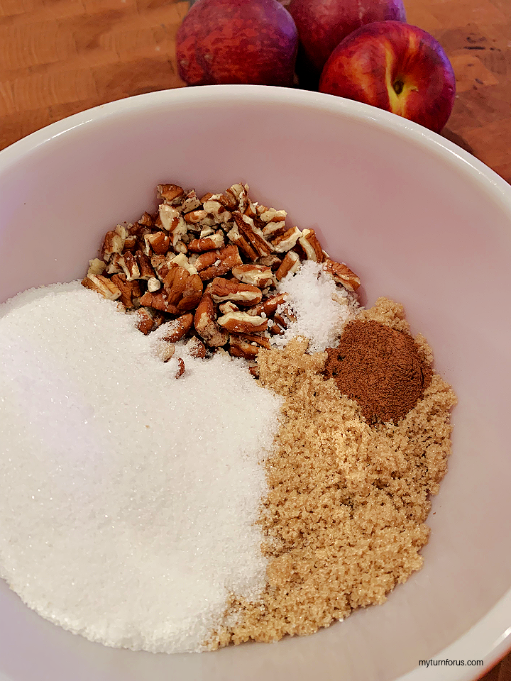 • Preheat oven to 350° F. Start the pecan streusel topping by stirring together chopped pecans, brown sugar, cinnamon and salt in a medium mixing bowl.