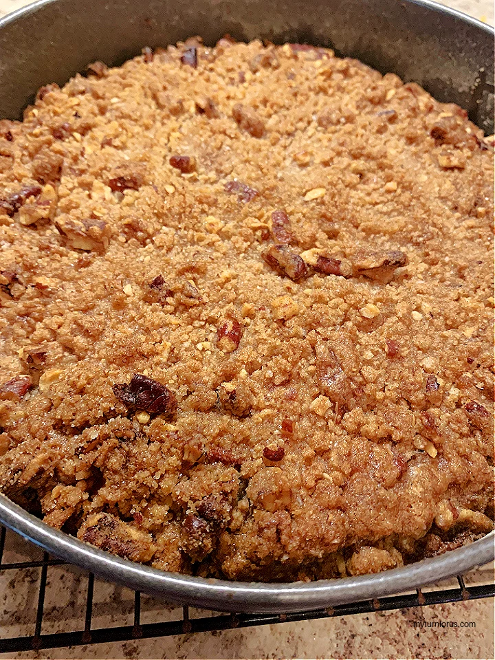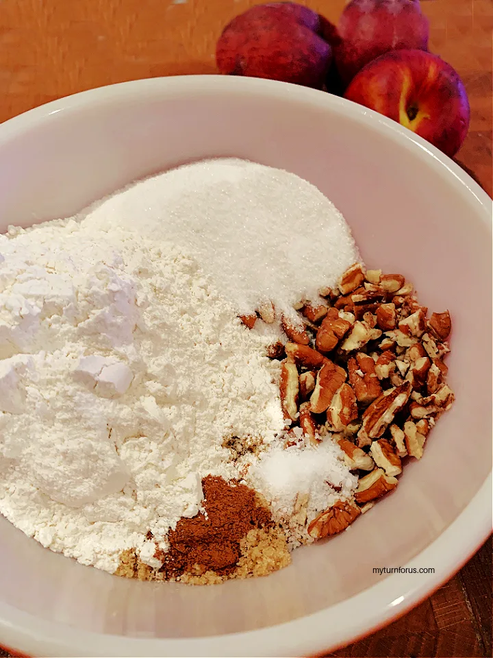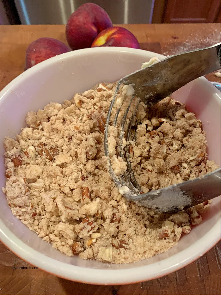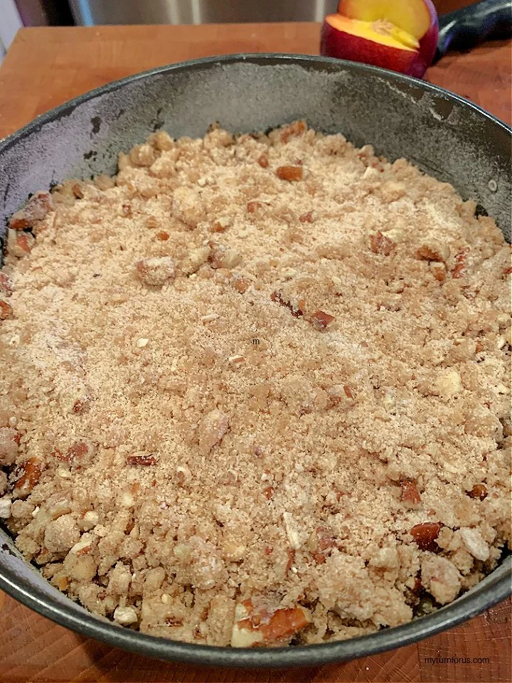 • Cover the top of the fresh peach cake with the pecan streusel topping. Spread evenly and press down lightly.