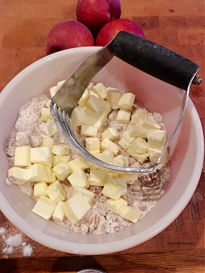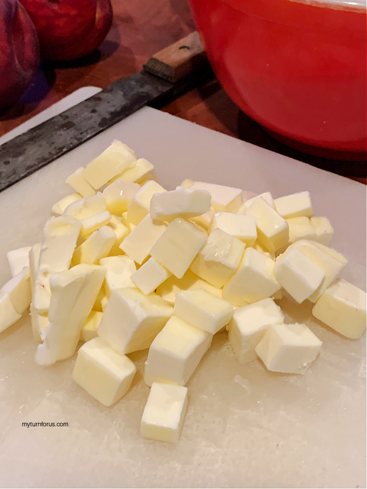 • Remove the cold butter from the refrigerator and cut into small cubes and add to the pecan streusel topping ingredients.