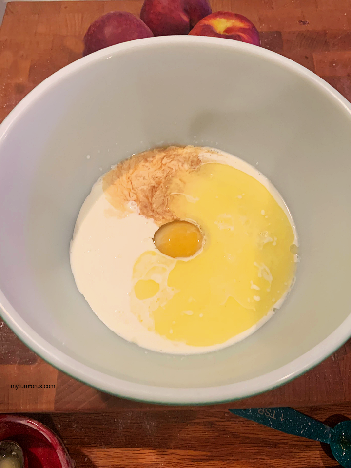 • In a different bowl, add egg, cream, vanilla and melted butter.