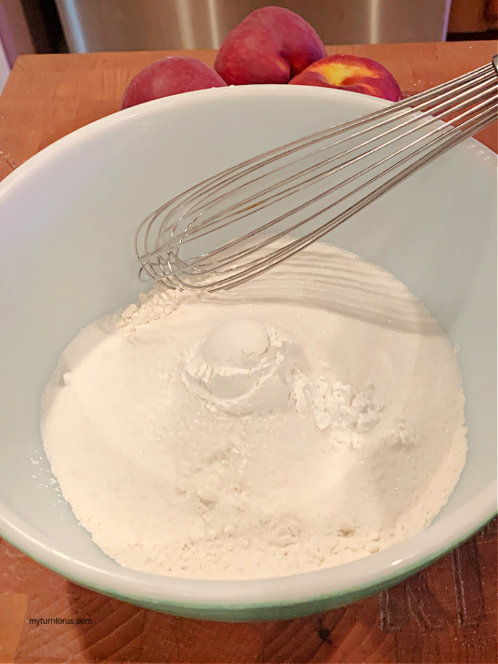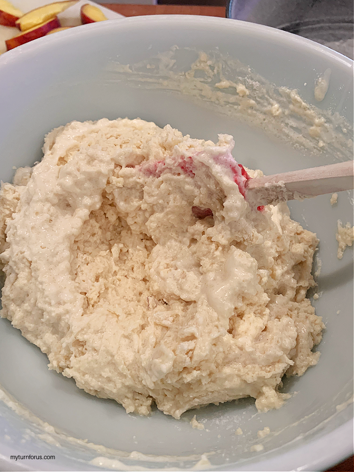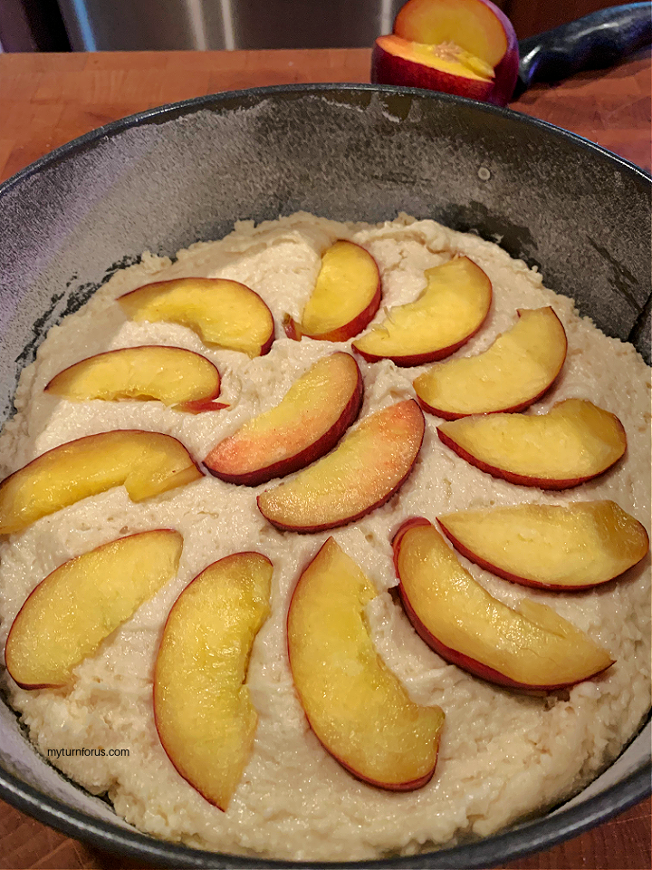 • Wash your fresh peaches and slice into 8 wedges. Arrange the peach slices evenly over the batter, pressing them into the batter just a bit.