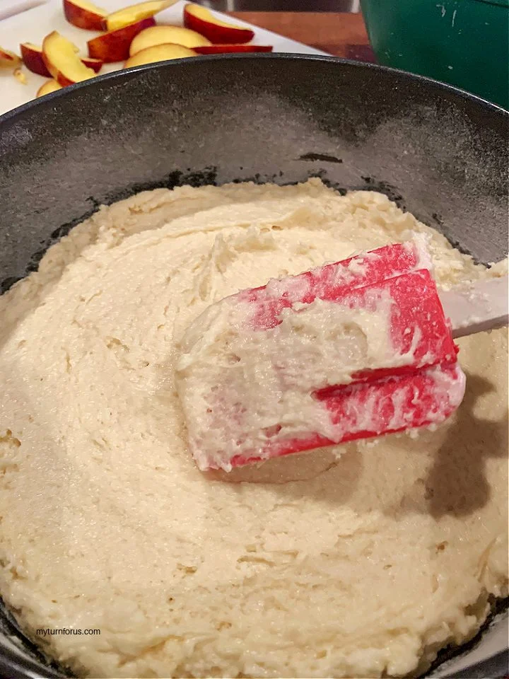 Wash your fresh peaches and slice into 8 wedges.  Arrange the peach slices evenly over the batter, pressing them into the batter just a bit.