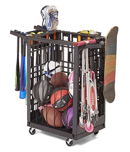 Families with sporty kids need a way to keep all the sports equipment organized in their garage. This rolling sports equipment organizer has space for balls, bats, sticks, skateboards, and any other sports equipment you need to round up after each practice.