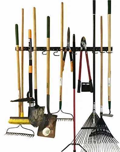Keep all your lawn and garden tools neatly organized in your garage with a hanging wall holder. This simple garden tool organizer uses hooks to hang each tool, ensuring you keep everything from your rake to your hedge trimmers organized when you’re not using them.