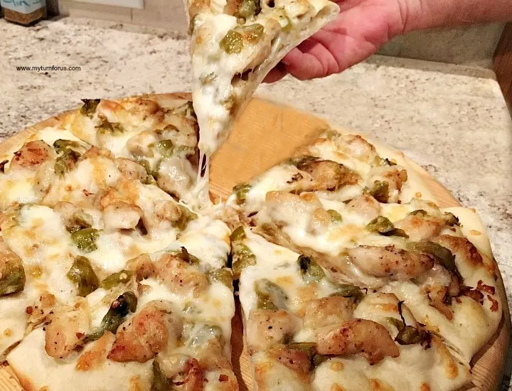 This Grilled Pizza recipe is topped with garlic infused chicken and roasted Hatch Green Chiles.