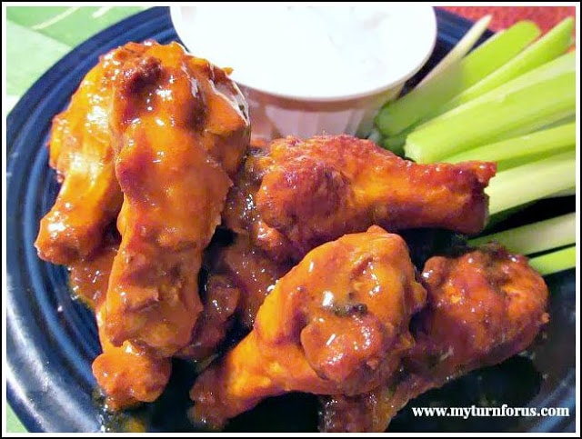 Fried Chicken wings with buffalo wing seasoning and served coated a homemade hot wing sauce.