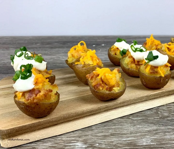 Make these mini potato skins with stuffed red potatoes. These little red potato skins are loaded potato bites topped with bacon, cheddar, sour cream, and green onions.