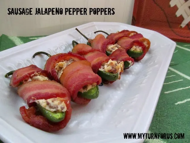 Cream cheese and sausage stuffed jalapeños that are wrapped in thick bacon
