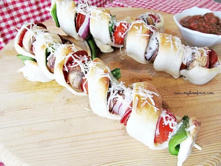 A Pizza recipe that places your favorite toppings on a skewer and wrapping pizza dough around it and served with sauce of the side