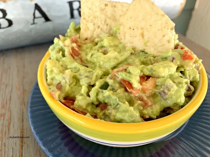 This is a spicy guacamole recipe using roasted jalapeños for the best guacamole seasonings. Also we have a little trick to make this a non-browning guacamole.