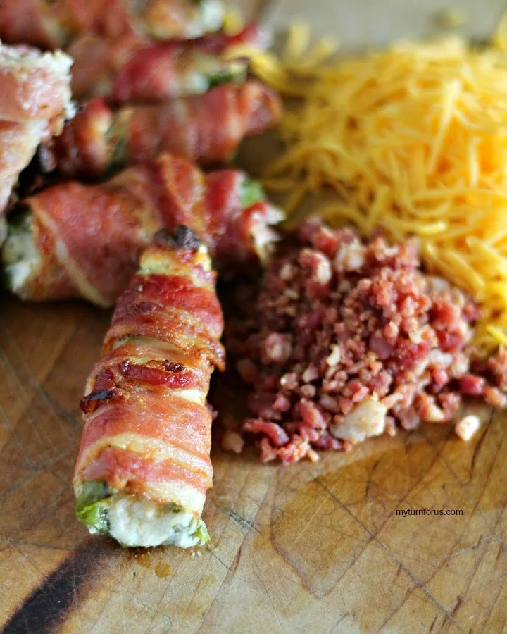 These stuffed hot peppers are filled with chicken, bacon, cheddar cheese, cream cheese, ranch dressing mix and then wrapped in bacon.