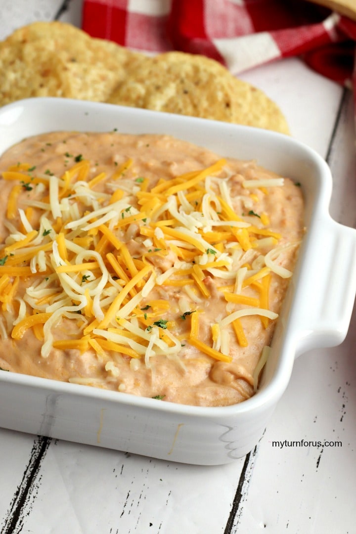 You can make this taco dip with cream cheese and salsa, sour cream and taco seasoning. Then top it with bright colors of shredded cheese and sliced green onions for a festive dip. Great tailgate food!