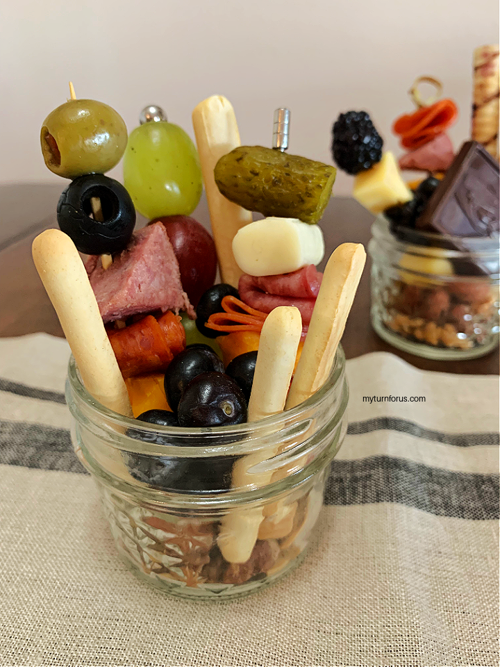These “Jarcuteries” contain typical antipasto ingredients or you could create a sweet version with cookie sticks, fruit and chocolate.