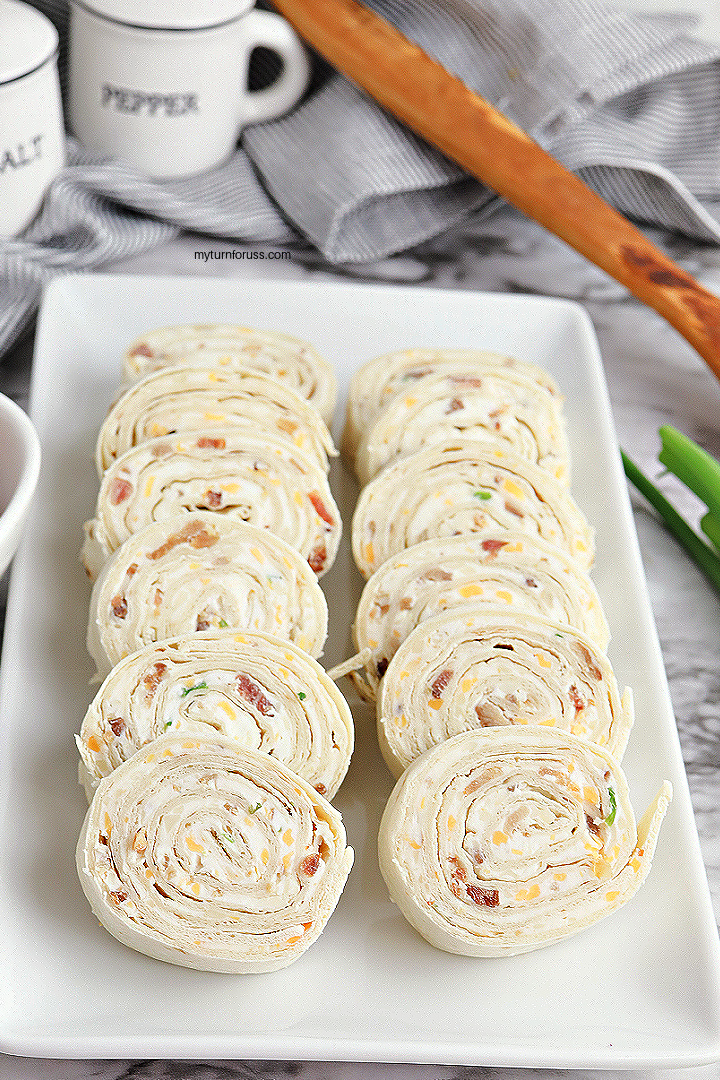 An easy cream cheese ranch roll ups recipe with cheddar cheese, bacon, ranch seasoning, and green onion.