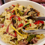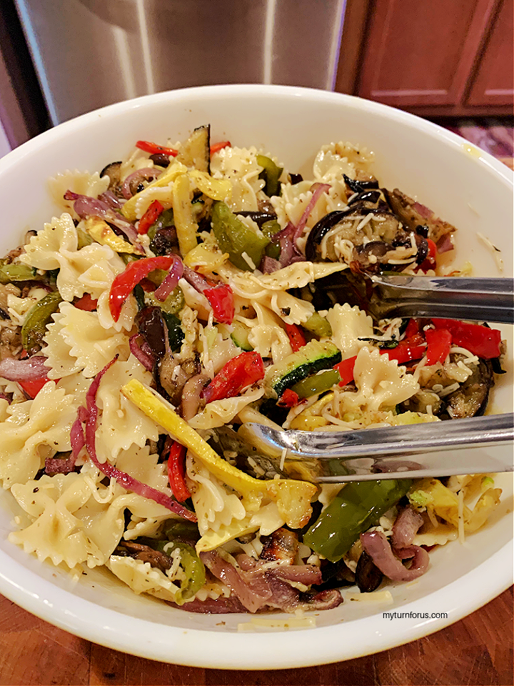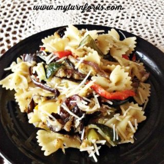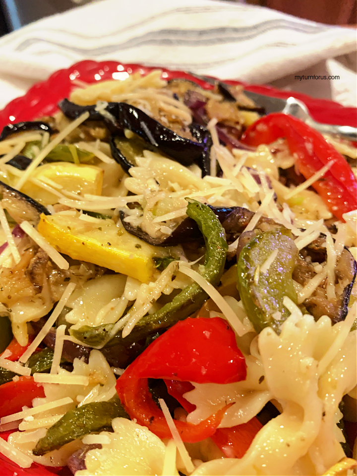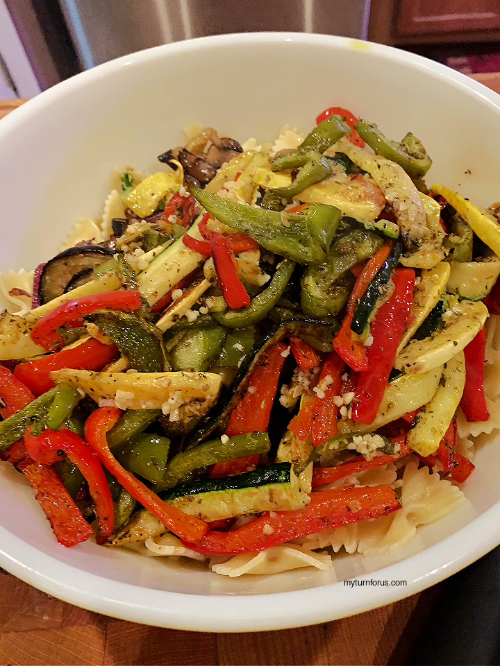 - Add all the roasted vegetables to the farfalle pasta and toss. Add the grated parmesan cheese and enough of the pasta water to moisten.