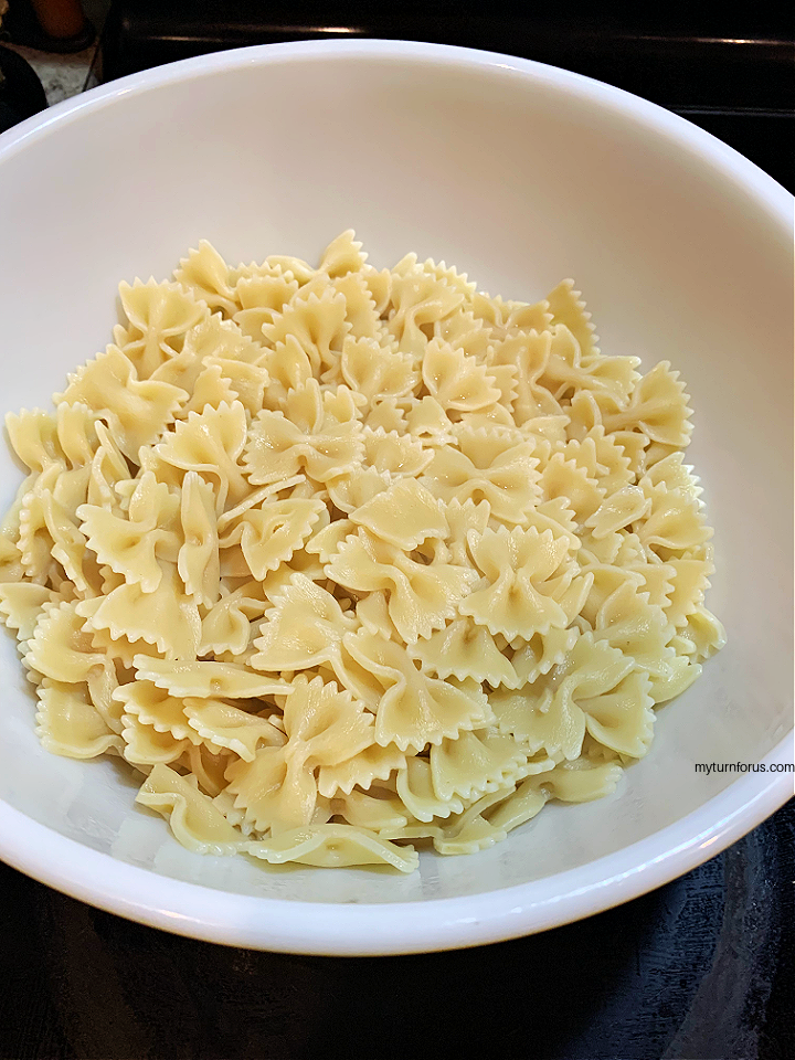 - Drain the pasta reserving 1-2 cups of the pasta water. Place the al dente farfalle pasta in a large serving bowl.