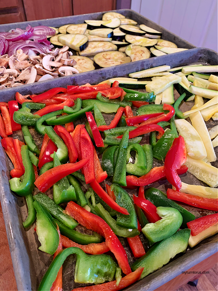 Place all the vegetables on two baking sheets, spreading them as thin as possible so they are able to roast.