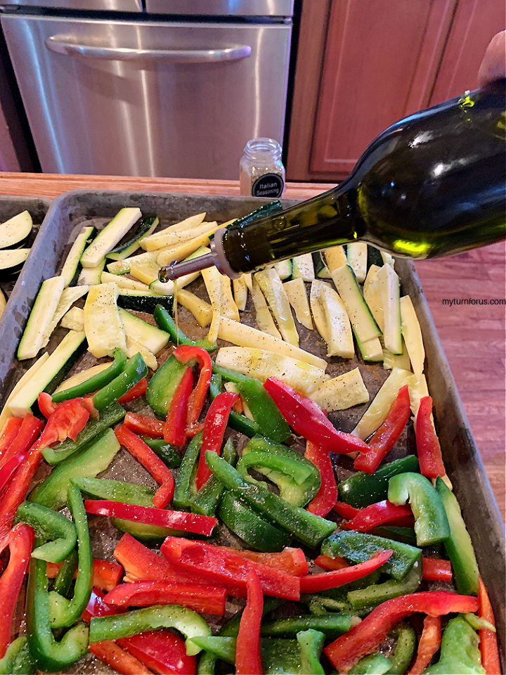 Drizzle the vegetables plenty of with olive oil and toss to evenly coat the vegetables for roasting. Season with salt and black pepper.