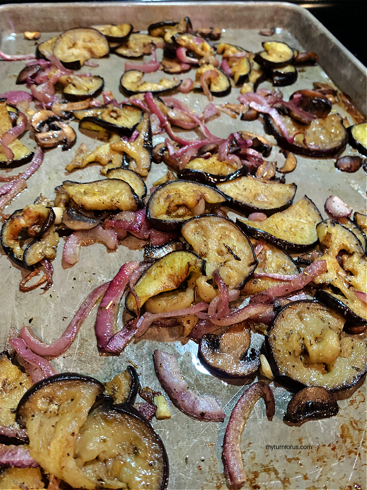 Toss and turn the vegetables a few times during the roasting. And continue to roast in oven until the veggies are caramelized and tender.