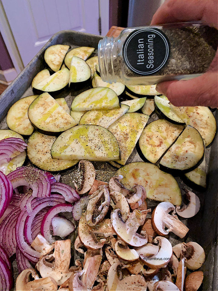 - Add the Italian seasoning and top with the minced garlic cloves. Toss all the vegetables to evenly mix. Place in the oven and roast for 35 minutes.