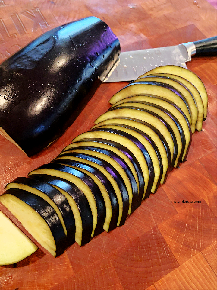 - Cut off the top and the bottom the eggplant. Cut into half lengthwise and slice.