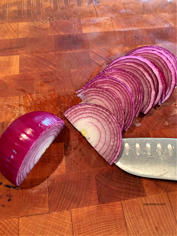 Peel the red onion and slice off the ends. Slice in half and then into thin slices.