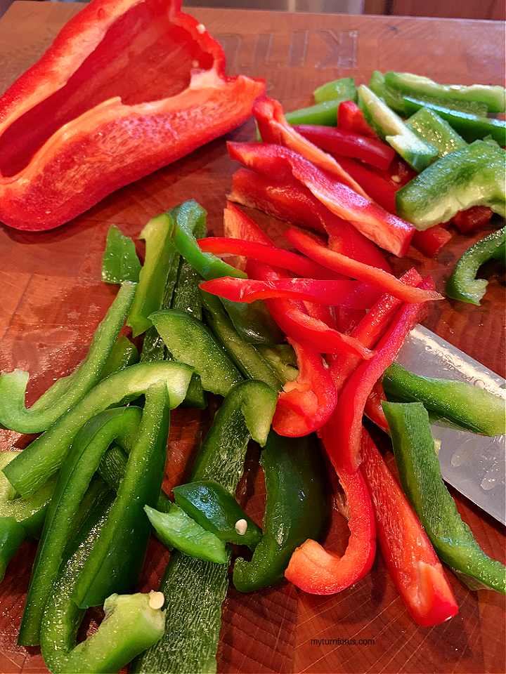 - Cut the peppers into half lengthwise and then remove all the seeds and membranes. Slice into strips and then cut strips in half to make sticks.