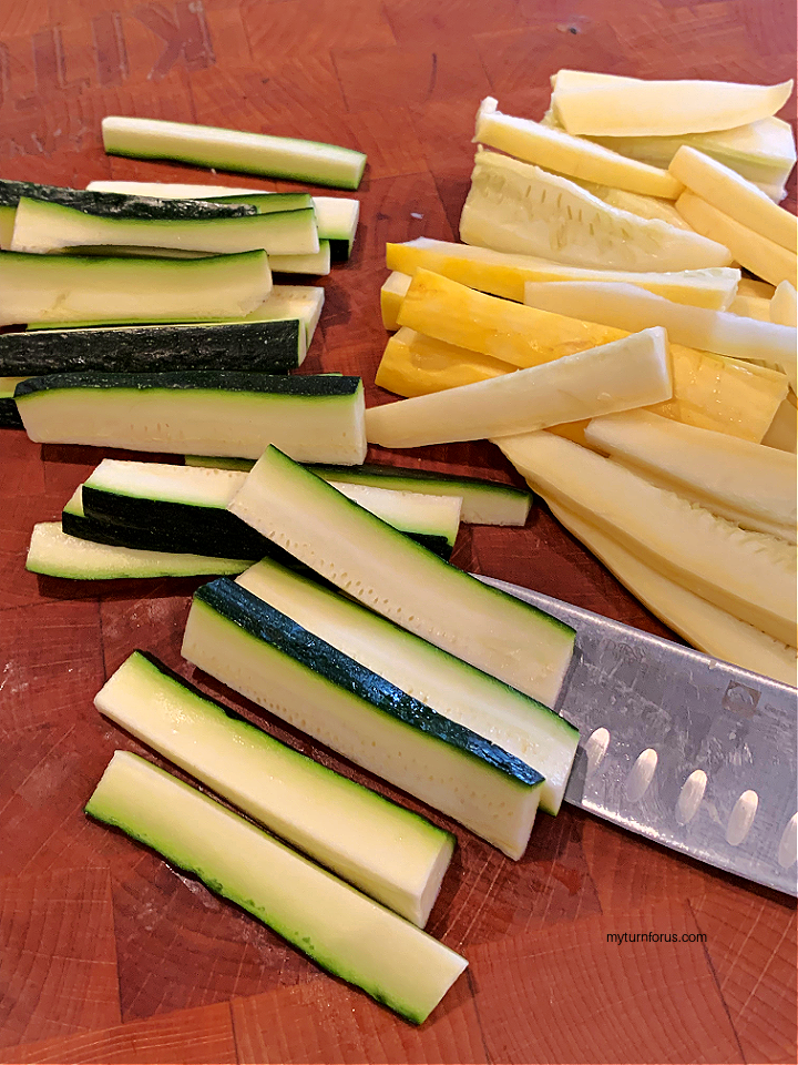 - Cut the zucchini and yellow squash into sticks. You can do this by cutting the ends off the squashes then cut into half. And then cut each half into half and slice into sticks.