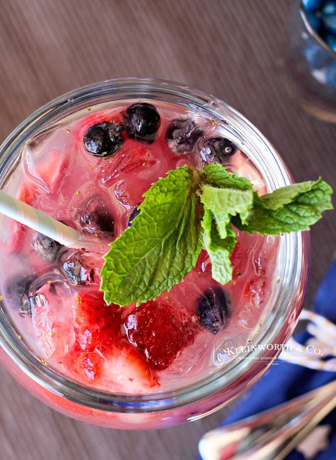 This unusual drink is made with a delicious berry vodka. And it is garnished with red raspberries, blueberries and white stars made from apple or honeydew for festive Patriotic cocktails.