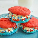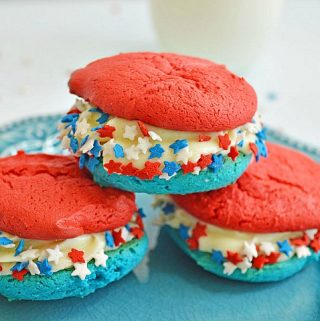 These patriotic cookies are cake mix cookies. This little red white and blue sandwich cookie is always fun to serve around the Fourth of July or Memorial Day.