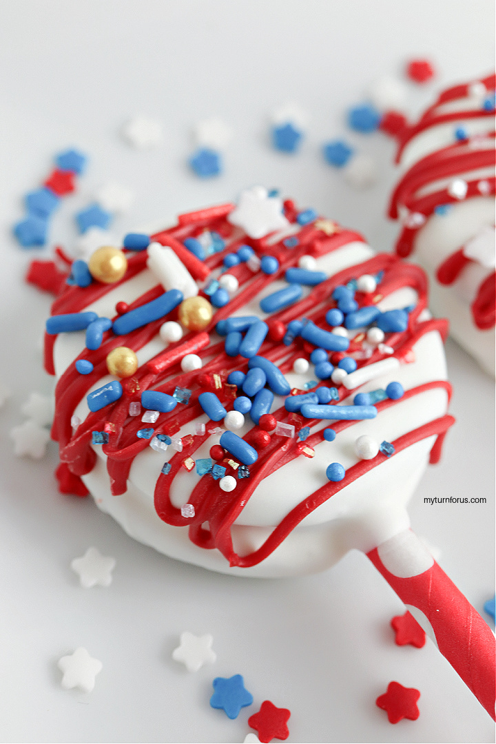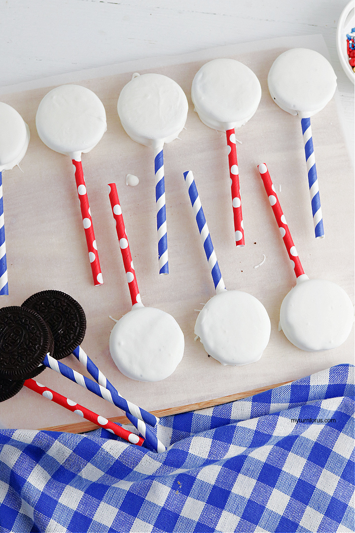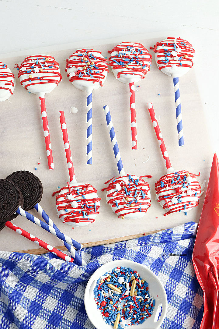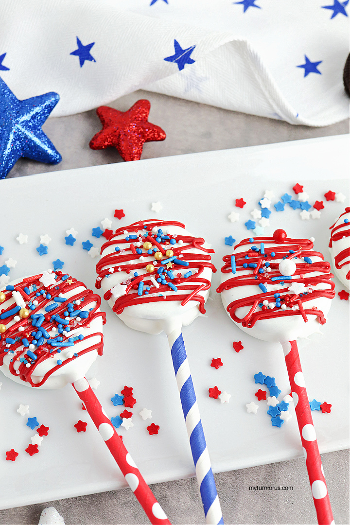 Serve these simple Patriotic Oreos Cookie Pops for Memorial Day weekend, Flag day or the 4th of July. You can easily make these red white and blue Oreos by dipping Oreo cookies in candy melts.