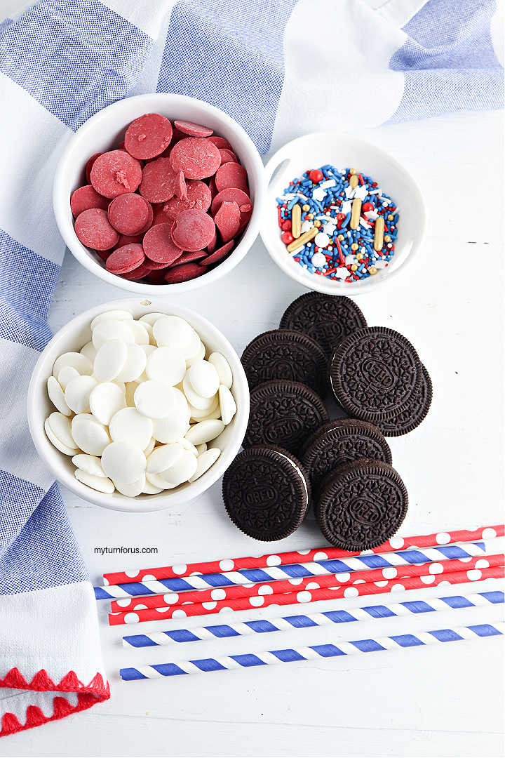 Cut the red white and blue paper straws in half and flatten one end slightly. Carefully slide the flattened end of the straw into the icing in the center of each Oreo.