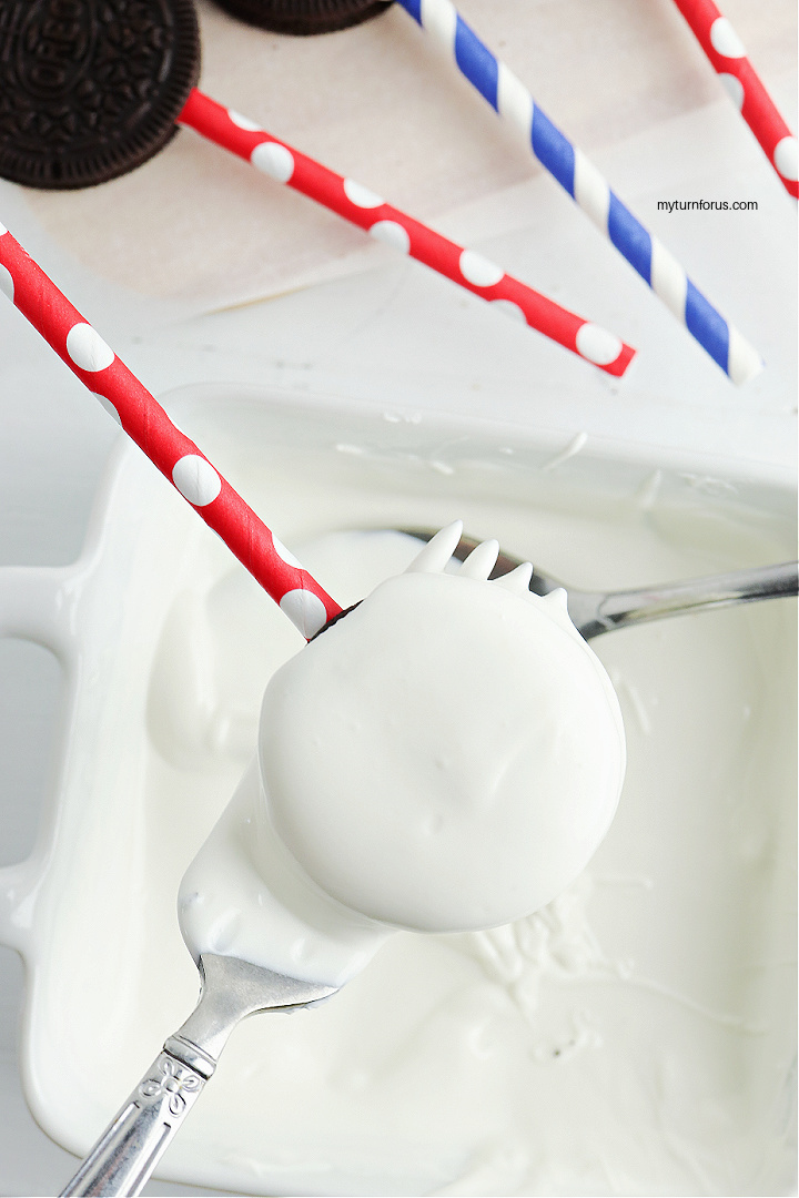 - Melt the white candy melts according to the package directions. (we use our Wilton candy/chocolate Melting pot) Dip the Oreos into the melted white chocolate and remove from the bowl with a fork. Lightly tape the handle of the fork on the edge of the bowl to remove excess chocolate.