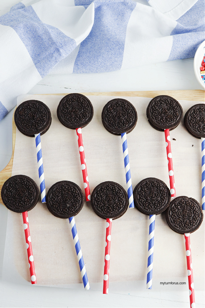 - Cut the red white and blue paper straws in half and flatten one end slightly. Carefully slide the flattened end of the straw into the icing in the center of each Oreo.