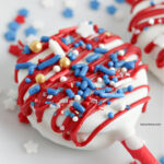 When the white chocolate is hardened, melt the red candy according to the package instructions and transfer to a piping bag. Drizzle the red chocolate over the top of the cookies, then immediately top with sprinkles while the chocolate is still soft. Leave your Patriotic Oreos on the parchment paper.