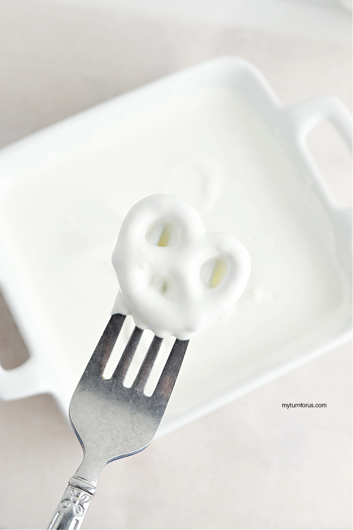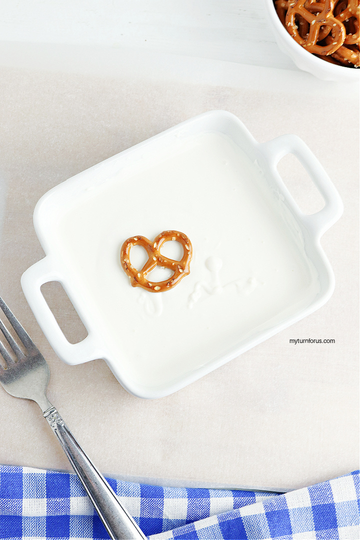 - Melt the white candy melts according the package instructions (we used our melting pot). Dip the pretzels into the melted chocolate to completely coat the pretzel.