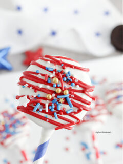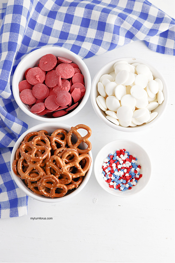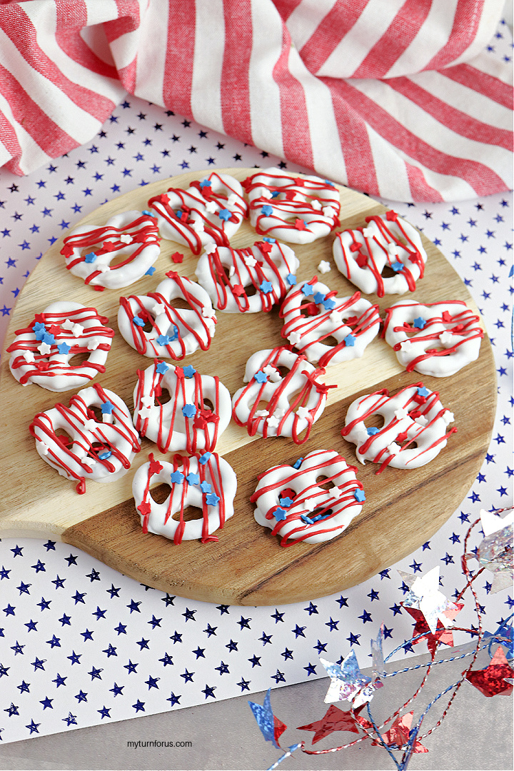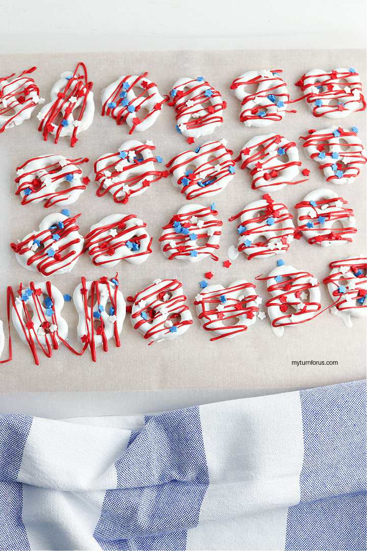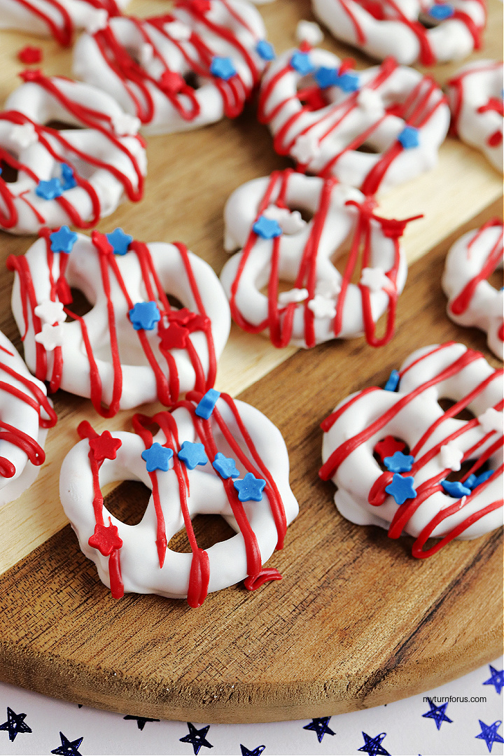 Allow the red chocolate to cool and harden before serving your patriotic pretzels for about 30 minutes. We are loving these salty pretzels covered with sweet candy melts and topped with red, white and blue sprinkles.