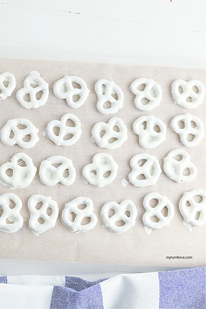 Place the coated pretzels on a piece of parchment or wax paper and allow them to cool and harden, around 30 minutes.