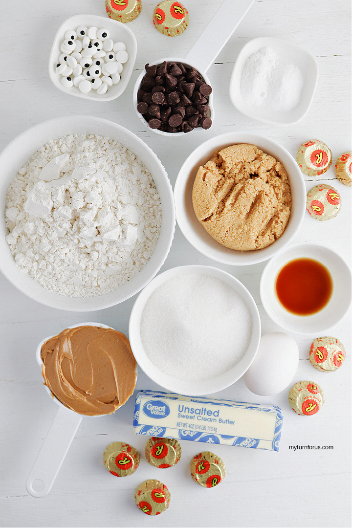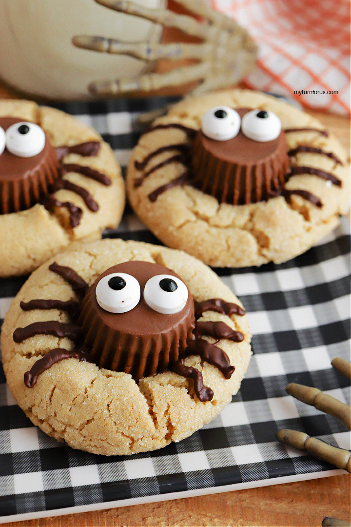 - Pipe eight legs on the sides of each peanut butter cup to make the peanut butter spider cookies. Also use the melted chocolate to attach two googly eyes to the top of each peanut butter cup to complete your spider snack cookie.