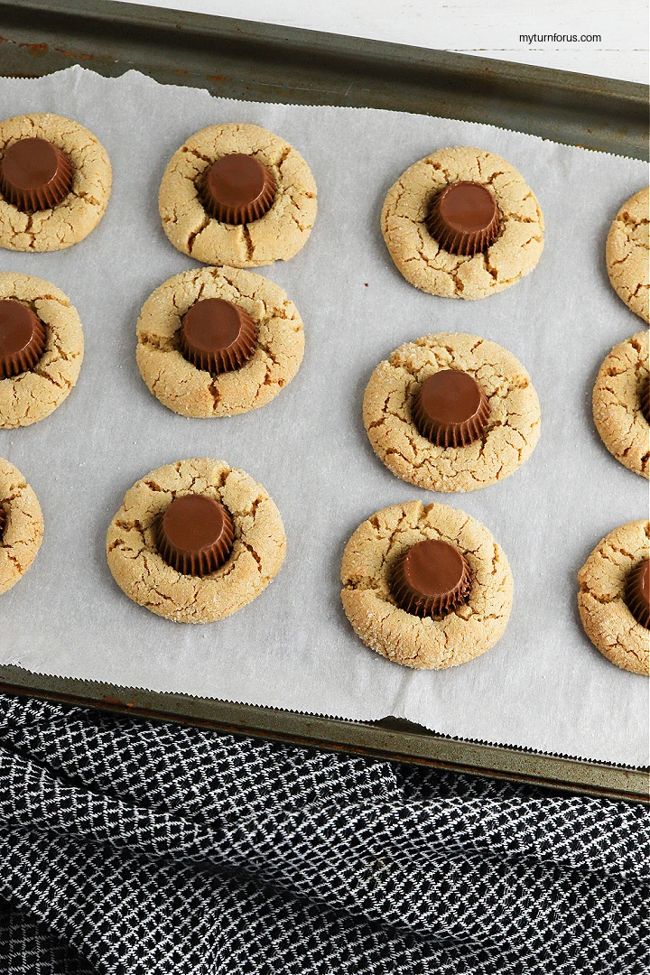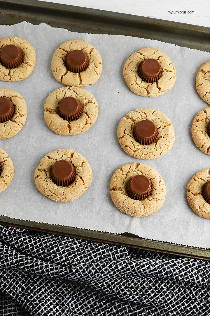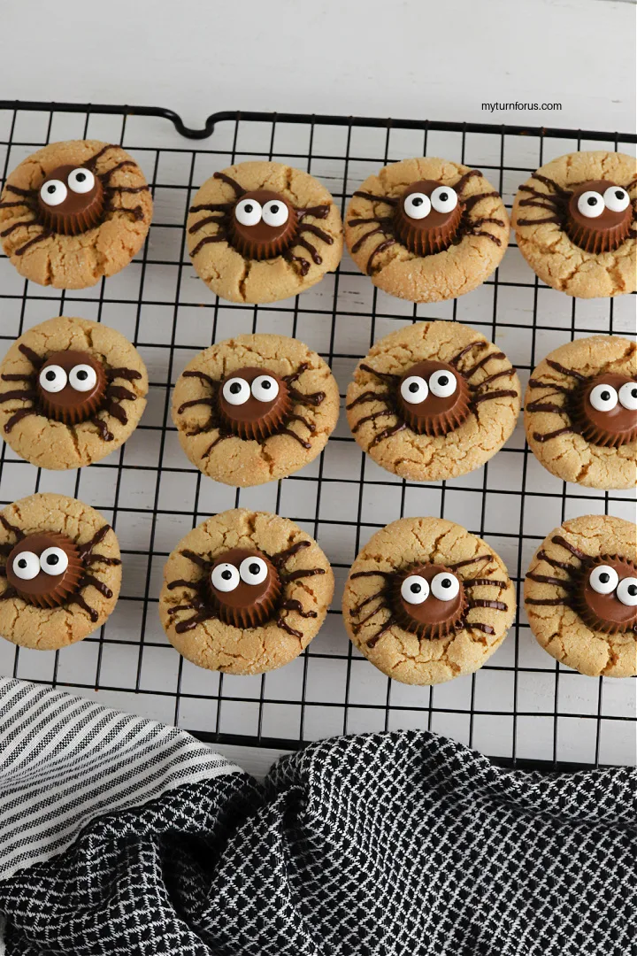 - Immediately after removing the cookies from the oven, press a chocolate peanut butter cup upside down into the top of each cookie. This will be the cute little spider’s body in the cookies.