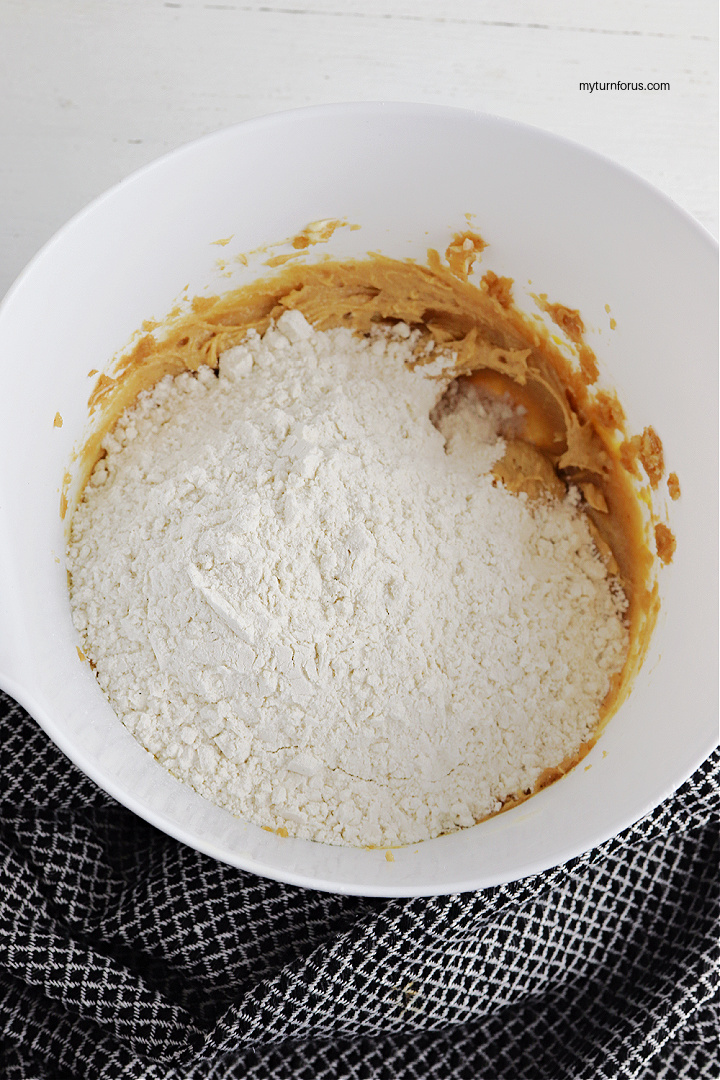 - Start your peanut butter spider cookies by making the dough. Add the flour, baking soda, and baking powder to a medium bowl. Whisk to combine all the dry ingredients together, then set your bowl aside.