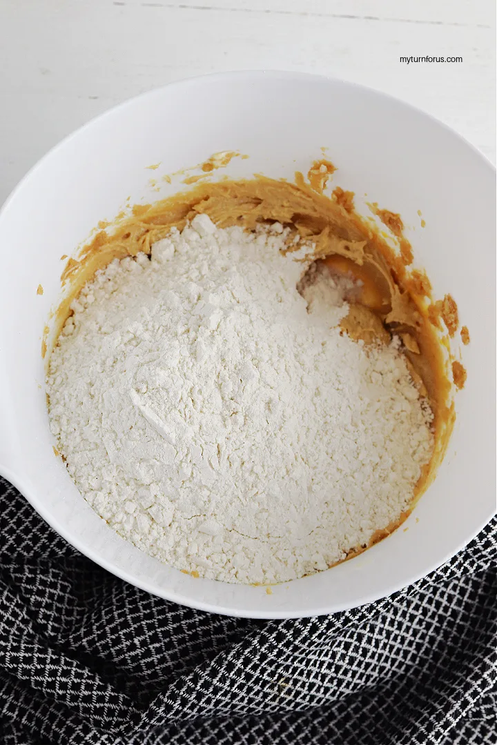- Add the flour mixture to the bowl with the peanut butter mixture. Beat the ingredients together on low until the dough begins to come together. If the dough seems too sticky , you can chill it for 30 minutes.