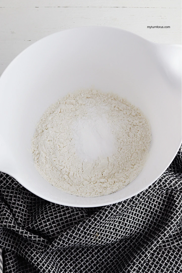 Preheat your oven to 375° F and line a baking sheet with parchment paper. Start your peanut butter spider cookies by making the dough. Add the flour, baking soda, and baking powder to a medium bowl. Whisk to combine all the dry ingredients together, then set your bowl aside.