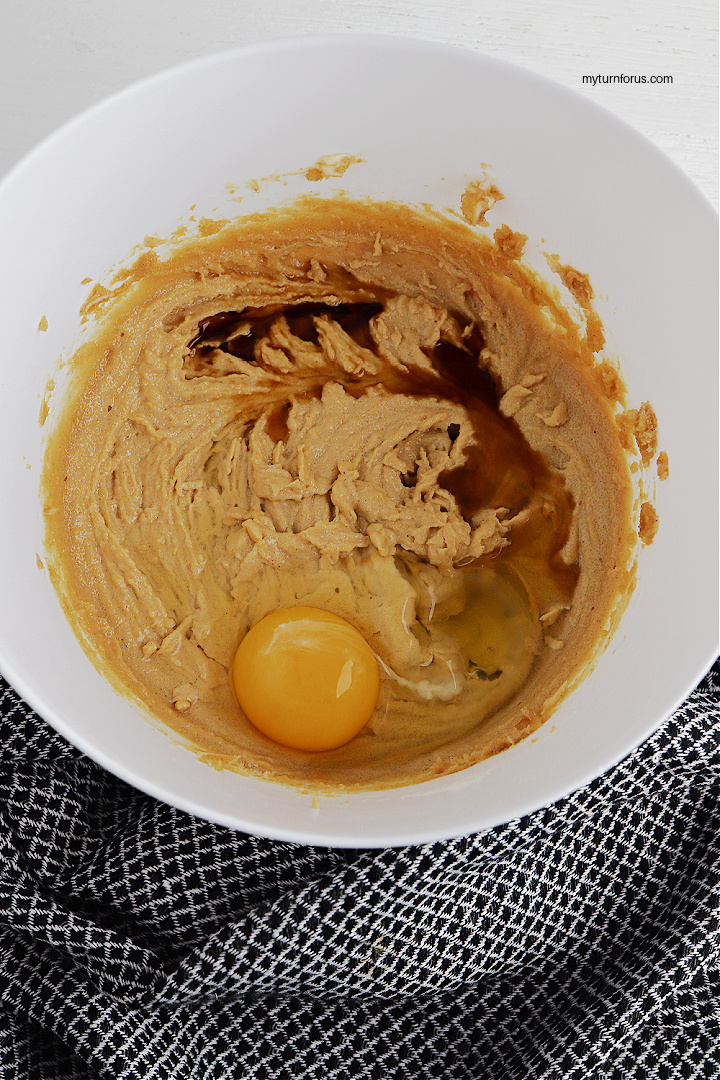 Add the egg and the vanilla extract and beat to combine all the ingredients. The mixture will be light and fluffy.