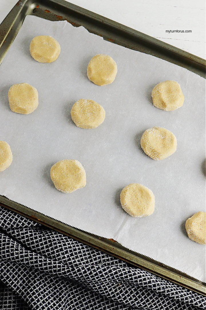 Place 1/3 cup sugar in a small bowl. Use a tablespoon or cookie scoop to scoop the dough and roll the dough between your hands to form an even ball. Then roll each ball in the sugar until it’s fully coated on all sides. Continue making cookie balls until all the dough has been used.