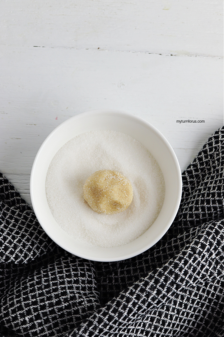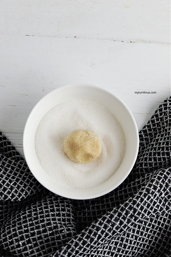 - Place 1/3 cup sugar in a small bowl. Use a tablespoon or cookie scoop to scoop the dough and roll the dough between your hands to form an even ball. Then roll each ball in the sugar until it’s fully coated on all sides. Continue making cookie balls until all the dough has been used