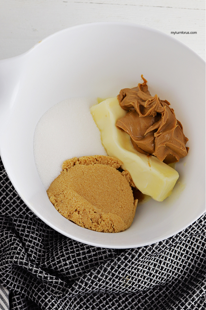 - In a separate large bowl, add the softened butter, peanut butter, sugar, and brown sugar. Beat the ingredients together until the mixture is smooth and creamy.