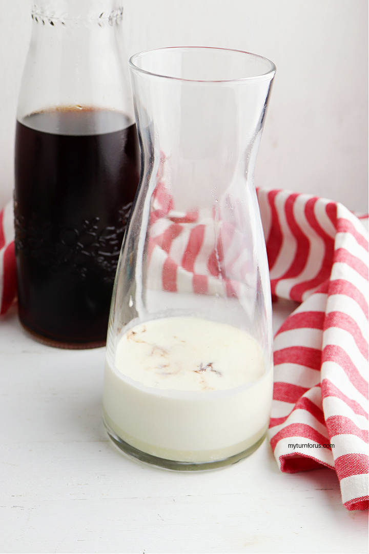 • in a jar or measuring cup, whisk together the heavy cream, milk, chocolate syrup, a few drops of peppermint extract, and sugar.