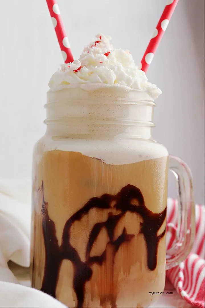 Pour the milk or half-and-half into a small jar, add a drop of peppermint extract, screw the lid on tight, and shake like crazy for 20–30 seconds. It creates thick, barista-style cold foam that sits beautifully on top and looks stunning sprinkled with crushed candy cane.