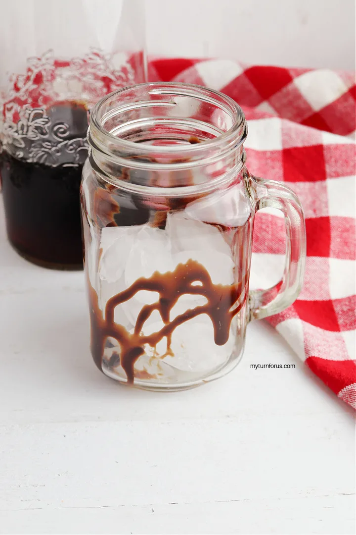 • Tilt the glass and slowly spin it while drizzling chocolate syrup down the inside walls for pretty ribbons of chocolate. Then fill the glass to the top with ice cubes.